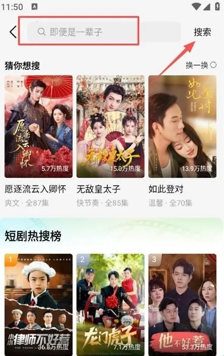 3、可以点击上方搜索框,输入短剧名称或关键词进行搜索
