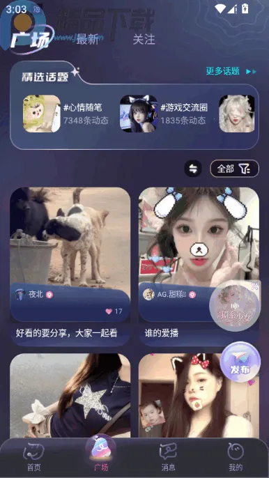3. 广场话题:多元话题助结识同好,参与热门讨论,分享生活倾诉感受,找志同道合伙伴。