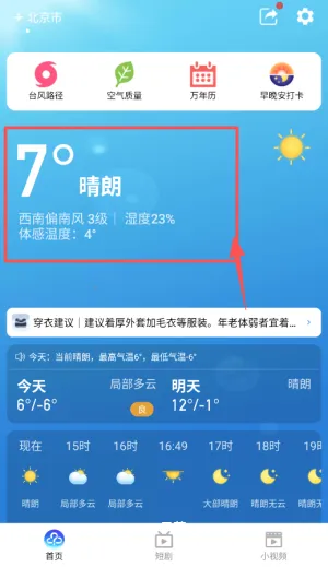1、打开应用后首先允许定位权限软件会自动展示您当前城市的天气概况包括温度体感和基本气象条件。