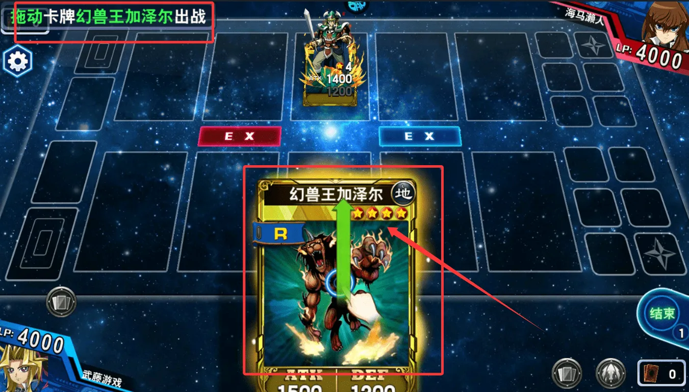 2、这是一款以卡牌召唤与对战为核心的策略游戏,基础操作是通过手指拖动屏幕上的卡牌到指定区域,例如将“幻兽王加泽尔”拖至场上,便能召唤该怪兽卡牌进入战场准备战斗。
