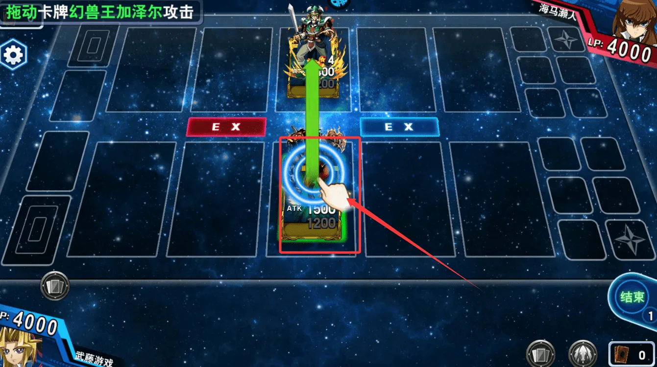 3、召唤出的卡牌拥有攻击力与防御力等数值,通过将己方怪兽卡牌拖向对手的卡牌或直接攻击对手本体,可削减对方生命值,界面会清晰显示双方当前的生命数值与对战状态。